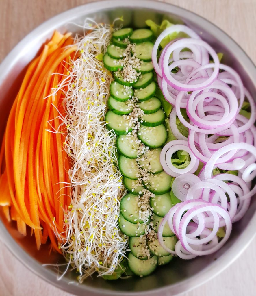 ✔ Buntes rohes Gemüse in verschiedenster Form: Raspeln, Scheiben, Stücke, Streifen, usw.